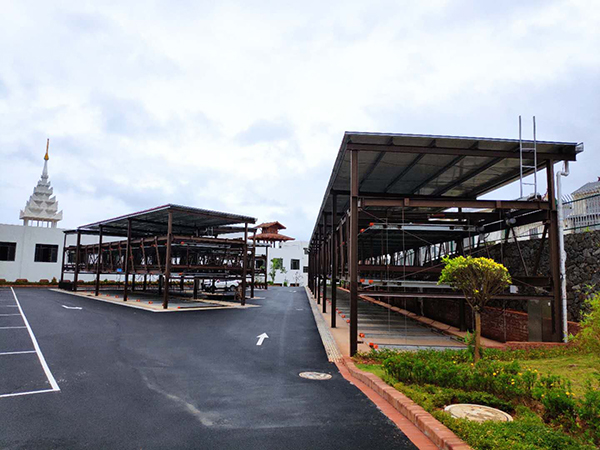 我公司制造安裝的位于西雙版納勐??h勐巴拉雨林小鎮(zhèn)地面機(jī)械立體停車庫,采用三層升降橫移類機(jī)械式停車設(shè)備,可停放144個(gè)泊車位,2020年9月22日檢測合格。
